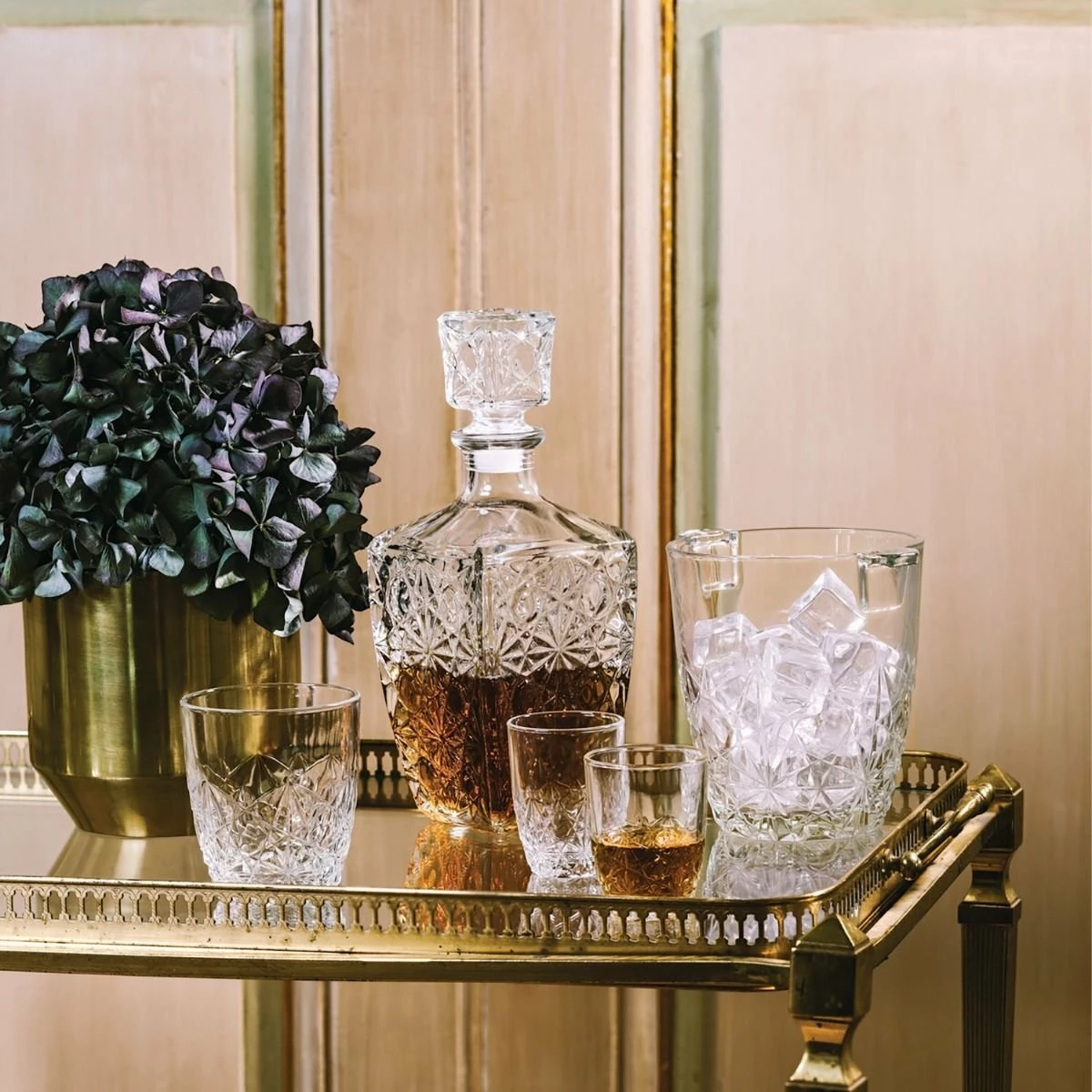 This 7 piece fine liquor set from Bormioli Rocco Dedalo Collection includes a 33.75 oz decanter and 6 matching 3oz shot glasses. Made from Italian cut glass the craftsmanship of this liquor set is unquestionable. The crackled ice cut pattern of the liquor set has a simple elegance that is ideal for everyday use as well as for special occasions. This set is dishwasher safe, but hand washing is recommended. The Bormioli Rocco Liquor set makes a wonderful gift for anyone who enjoys fine spirits or has a home bar.