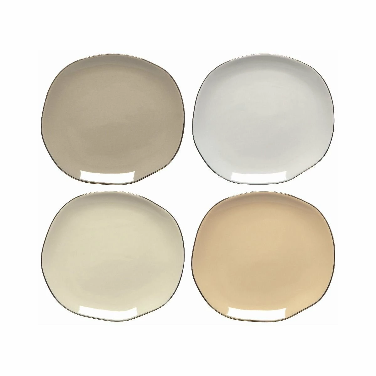 - Set includes four plates in light brown, cream, off-white, and nectar