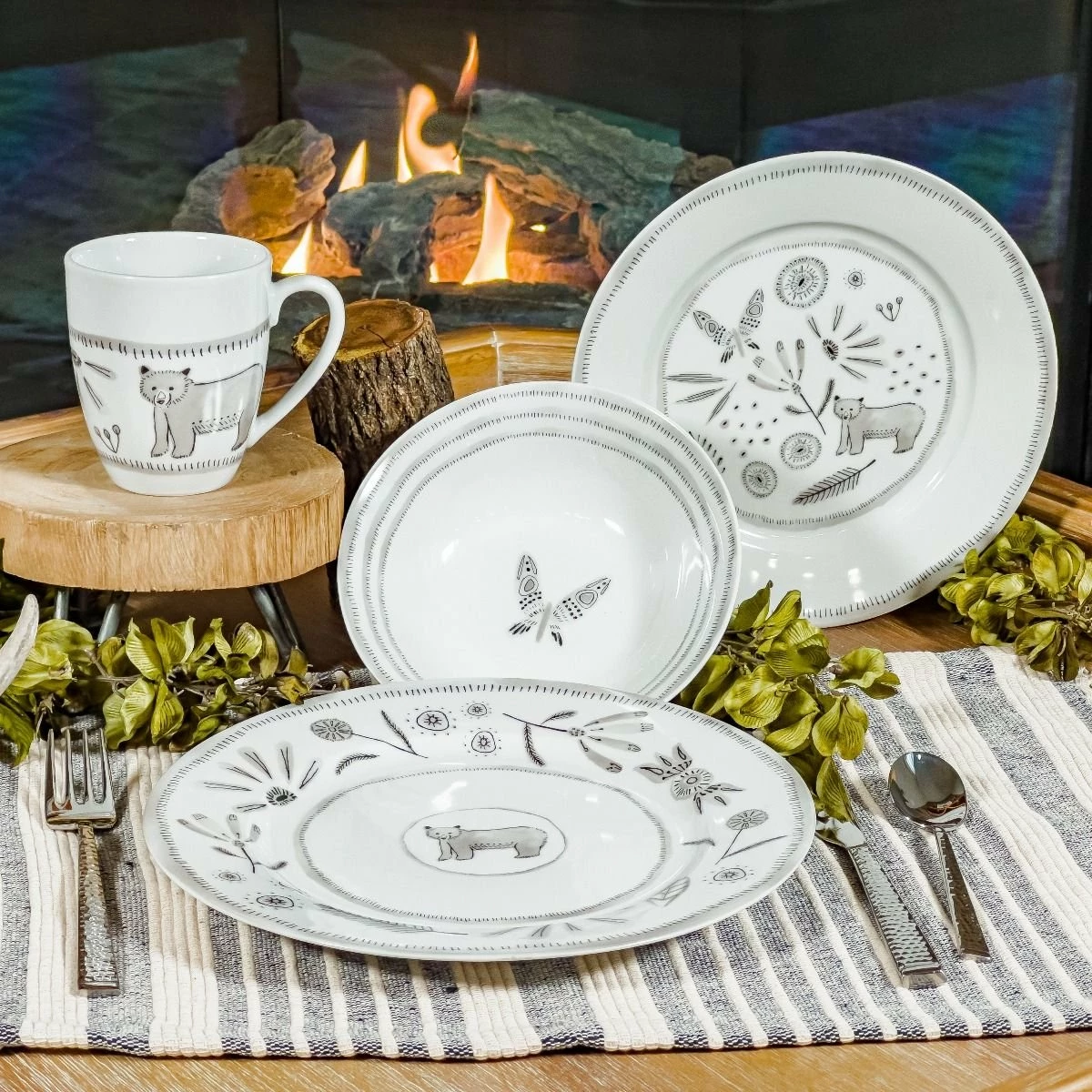 Do you love unique dinnerware but don’t want loud pieces that distract from your meal? Get the Bear With Me 16-Piece Dinnerware Set with Mugs from Everything Kitchens. This exclusive dinnerware set features a simple gray and white color palette that complements any kitchen decor. To add a little whimsy to the design, each piece features a unique combination of line-drawn flowers, sprigs, a butterfly, and the titular bear. This 16-Piece set comfortably serves four individuals. The Everything Kitchens exclusive dinnerware will add a rustic thread to your dinnerware collection while the soft gray tones retain a clean design that will appeal to a wide array of guests. Don’t wait, get this exclusive piece of Everything Kitchens dinnerware and add it to your table today!