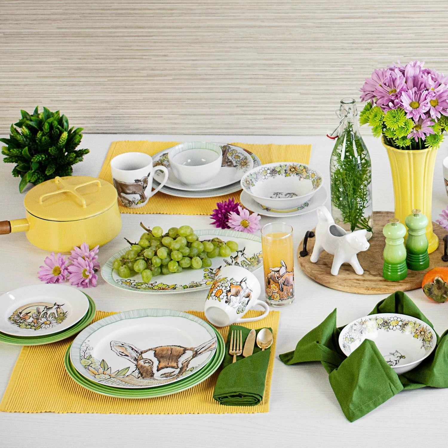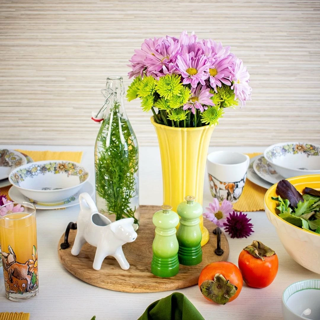 Designed by a pair of local artists exclusively for Everything Kitchens, this playful dinnerware collection features the curious “Caprine Caper” Baby Goat, the lovely “Leaping Lambs” Baby Lamb, the darling “Have a Cow” Jersey Calf, and the charming “Hold Your Baby Horses” Horse Foal. Each piece within the collection is crafted from microwave and dishwasher-safe porcelain or glass and is embellished with unique, hand-drawn illustrations guaranteed to bring a touch of playful fun to your table setting! For harvest dinner parties, springtime brunches, and everyday use, bring the farmyard to your kitchen with the Exclusive Everything Kitchens Barnyard Baby Animals Dinnerware Collection today!