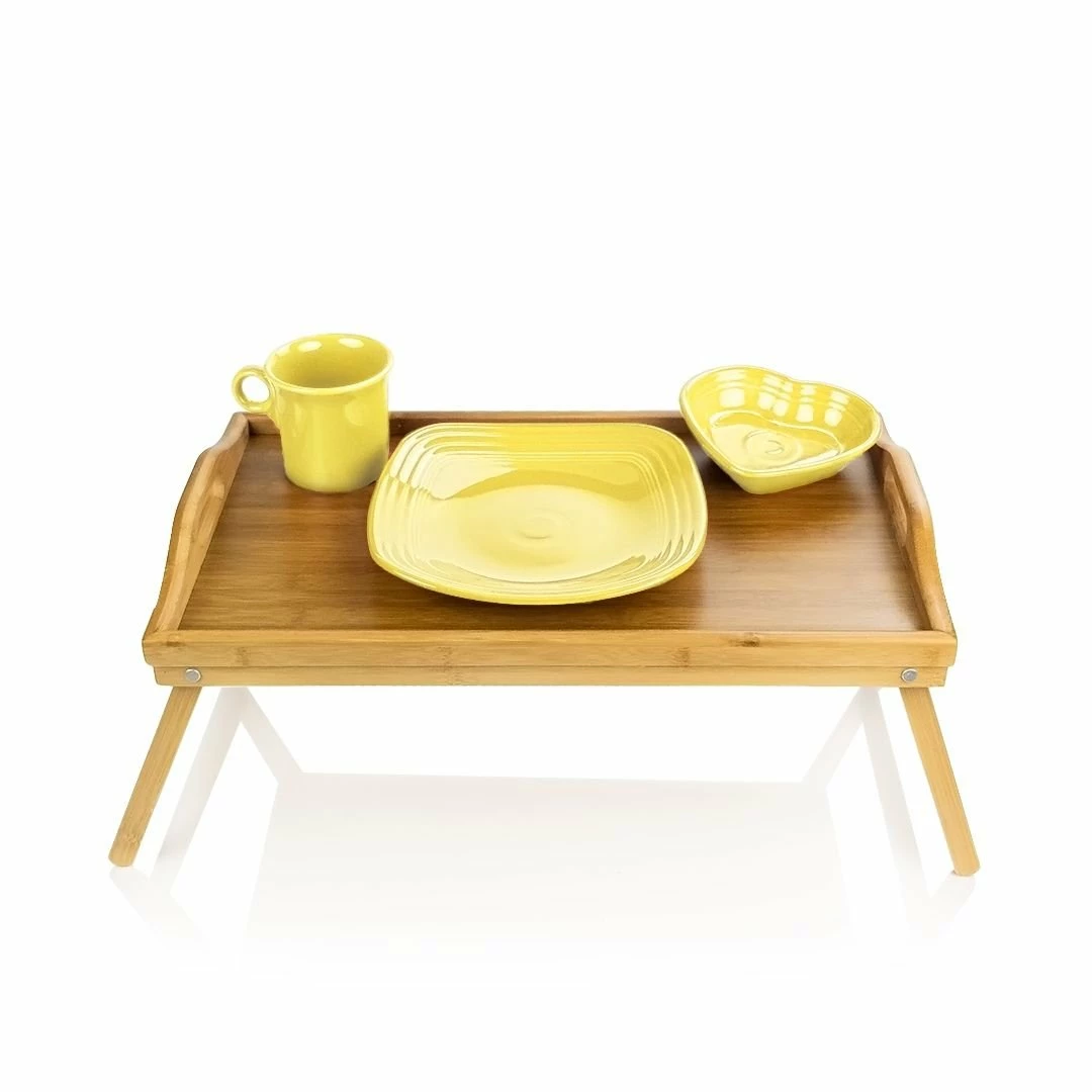 The Everything Kitchens Exclusive “Breakfast in Bed” set includes a large bamboo serving tray with fold-out legs for stability and sturdy handles for safe carrying. No worries if you drip pancake syrup or strawberry jam on the tray, simply wipe clean with a damp cloth. Make an equally impressive statement with the bright Sunflower Fiesta® Heart Bowl, Square Plate & Coffee Mug in the set. All of the dinnerware pieces are dishwasher safe, oven safe & microwave safe.