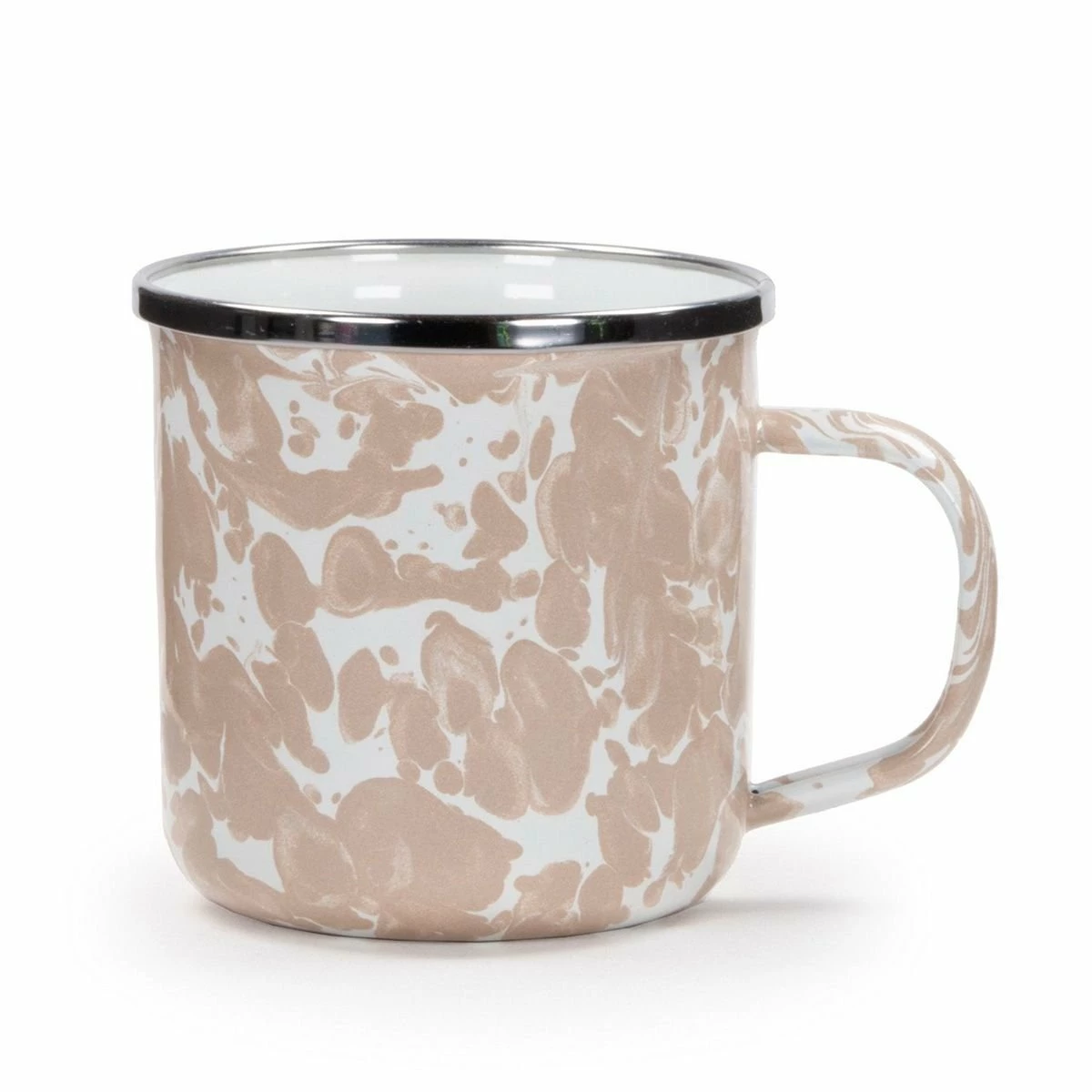 Introduce the distinct look of classic enamelware to your kitchen and table with Golden Rabbit Enamelware 12oz Mugs in contemporary creamy Taupe Swirl (Set of 4)! The warm taupe splatters on these mugs are blended with a rich white background and perfectly accented by the signature stainless steel rim. Like all Golden Rabbit enamelware, these mugs are crafted from lightweight carbon steel and then coated with premium Belgian porcelain to create a non-stick fused porcelain finish that is dishwasher safe and can handle a wide range of temperatures. The durable porcelain finish is strong enough to withstand a lifetime of stirring and mixing whatever drinks you serve in these heirloom-quality mugs.