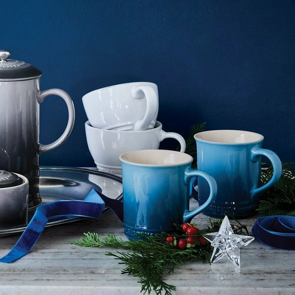 Pour yourself a morning brew, an afternoon spot of tea, or an evening cup of hot chocolate in this lovely Le Creuset 14oz Stoneware Mug in Marseille Blue for that blissful moment you can call your own. The dense stoneware blocks moisture absorption to prevent cracking, crazing, and rippling and can withstand the broiler, microwave, and oven for a variety of uses. The Nearly-nonstick glazed interior easily releases foods for quick cleanup for the days when soup or other comfort foods are a must.