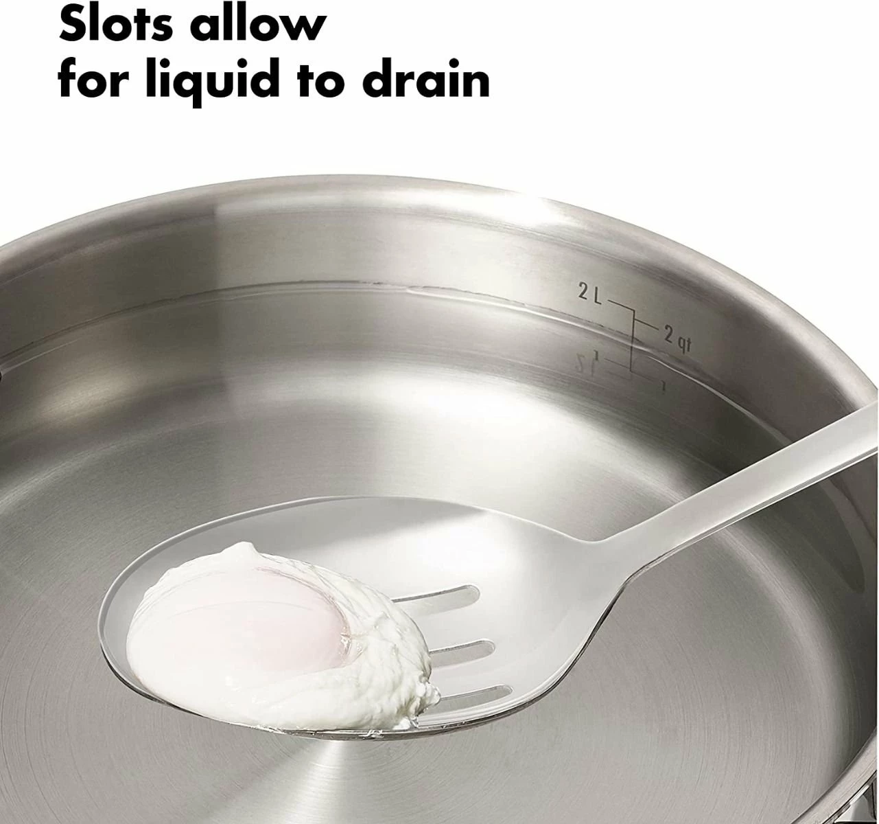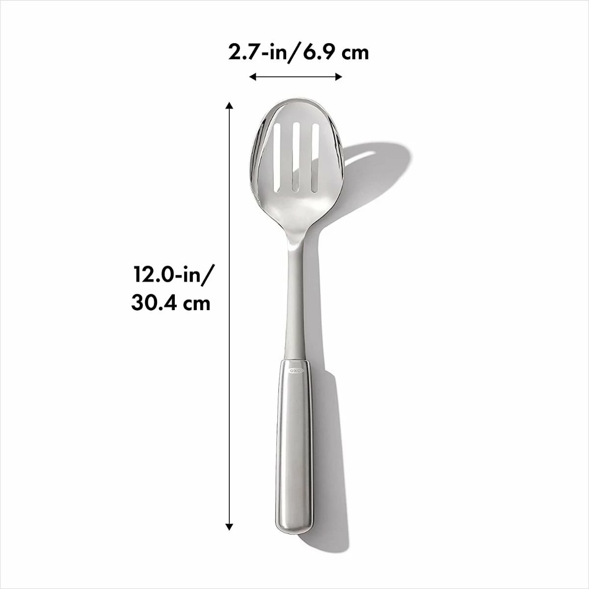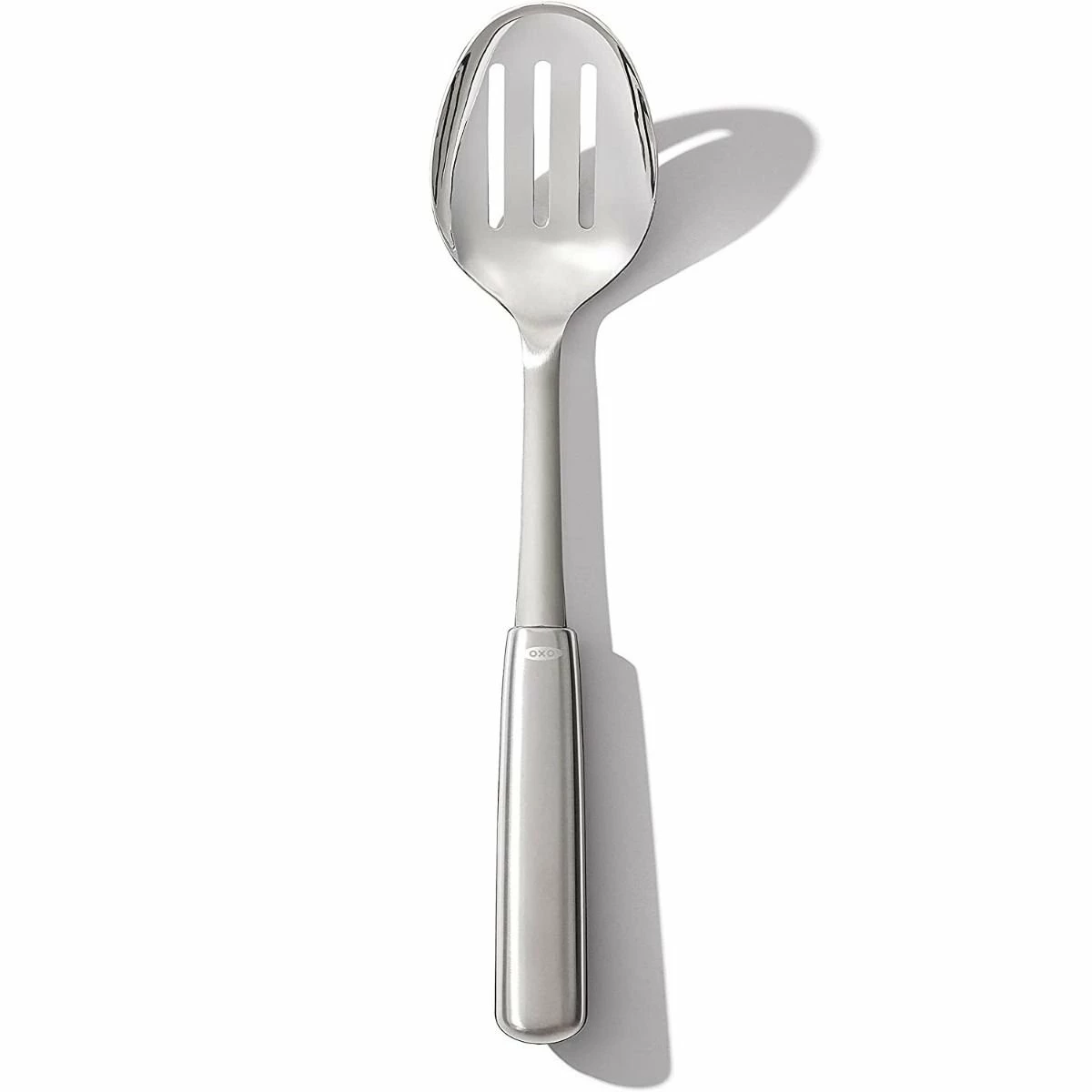 Need to strain veggies out of a pot? Scoop meatballs from sauce? Stir a homemade soup? The OXO Steel Slotted Spoon is the tool for all these tasks—and more. Its slots have been designed to allow liquid to drain through without making a mess, the whole thing is well balanced, and the stainless steel construction makes the Spoon extra sturdy. Plus, the comfortable handle features a non-slip touchpoint for added comfort and the sleek, timeless design means you can use it in the kitchen or at the table.