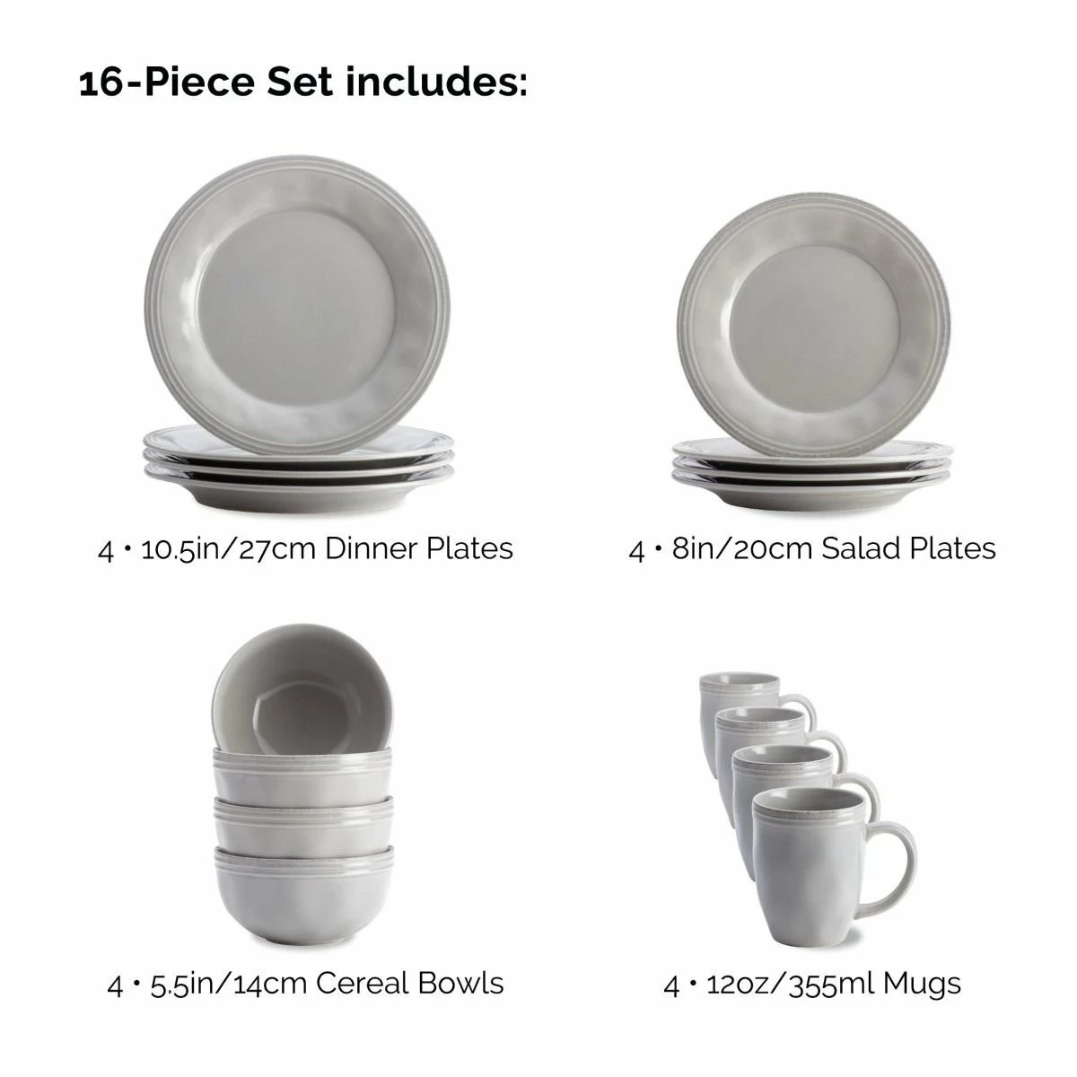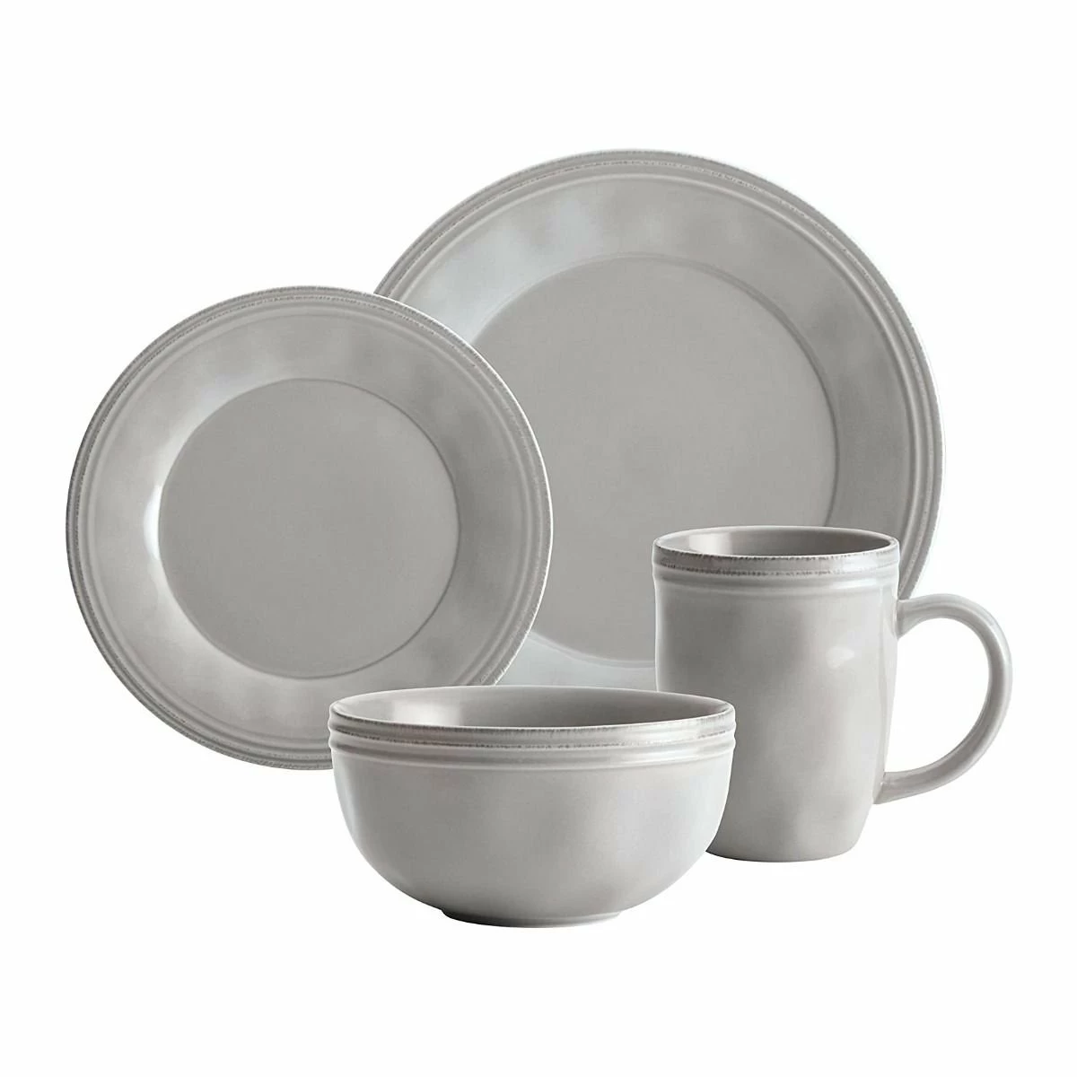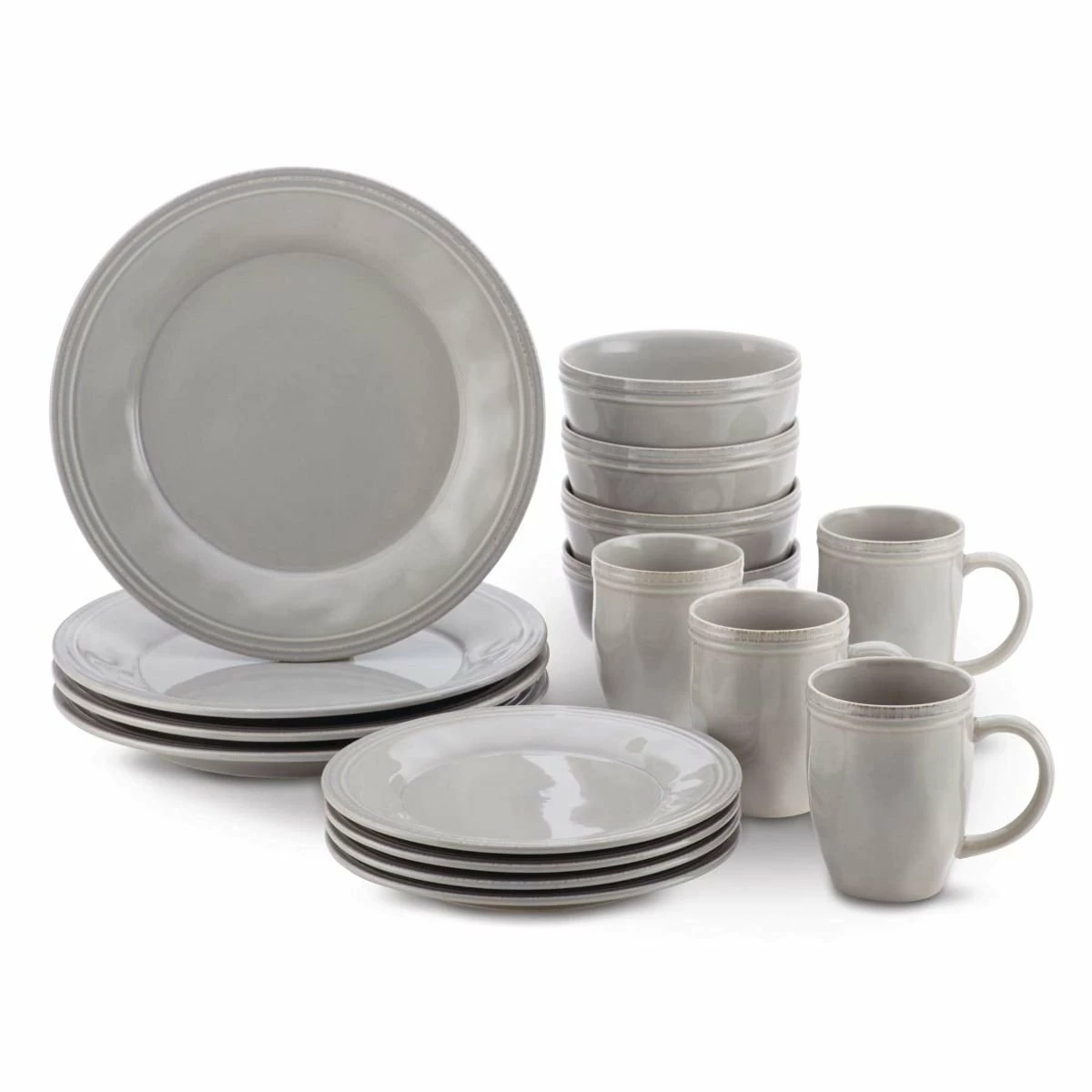 Bring a warm & inviting look to your table with the Rachael Ray Cucina Collection 16-Piece Dinnerware Set in Sea Salt Gray. The Cucina Collection blends Rachael Ray’s simple, casual style with handcrafted touches & antiqued textures for a stylish set of dinnerware that’ll compliment any kitchen aesthetic. This set includes four 10.5″ dinner plates, four 8″ salad plates, four 5.5″ cereal bowls, & four 12 oz. mugs. Each piece is crafted from stoneware and finished with a stain-resistant glaze that’s microwave, dishwasher, freezer, and oven-safe for durable everyday pieces that are easy to maintain. From holiday gatherings to casual dining, the Rachael Ray Cucina Collection Dinnerware will add a welcoming touch & rich backdrop to your favorite dishes & recipes!