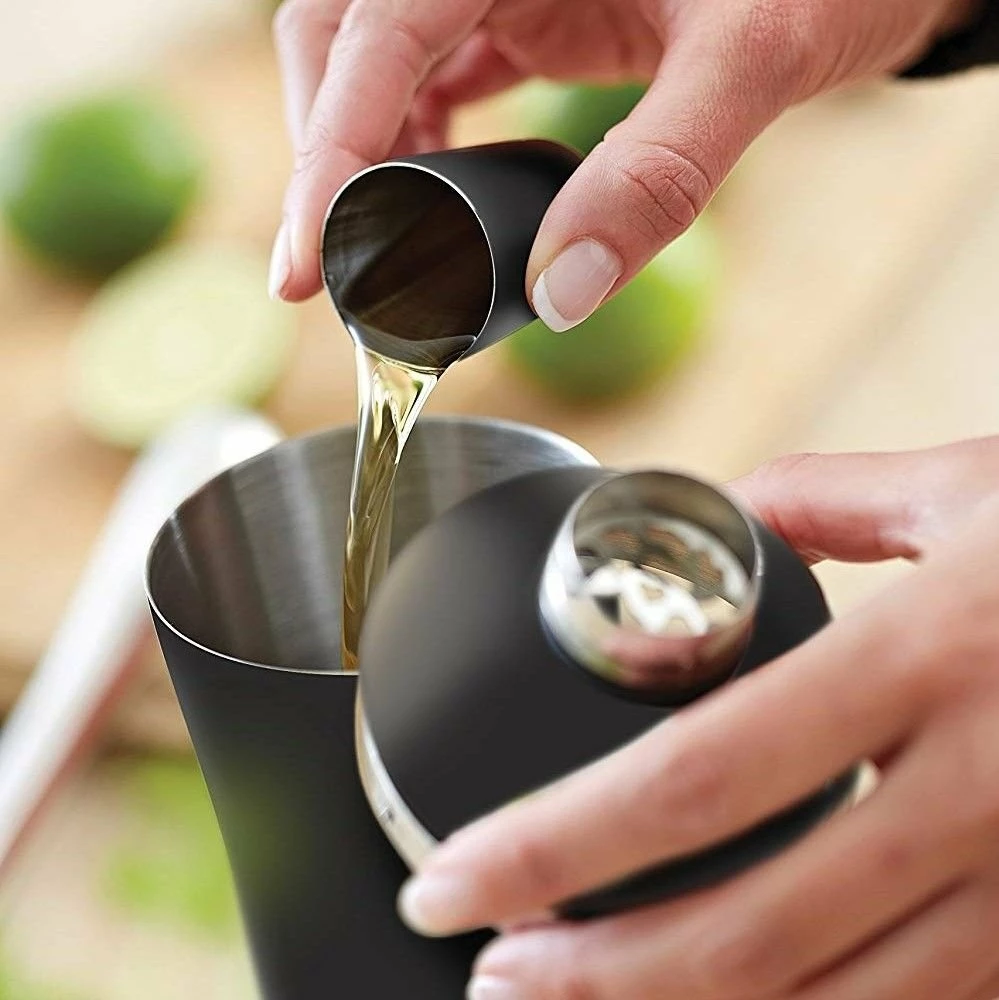 Serve up your favorite cocktails in style with the Swissmar Nuance 3-Piece Cocktail Shaker in Matte Black! This all-in-one 16.9 oz. cocktail shaker is crafted from stainless steel and finished with a smooth, black matte rubber coating that provides a soft-grip and a unique, modern look. With a built-in strainer and a lid cap that doubles as a measuring cup for quick and easy drink prep, this 3-piece set is fitted with silicone rings in the lid and lid cap for a tight, reliable seal. Plus, its slim design is perfect for one-handed shaking. For a shaker set that’s as sleek as it is functional, add the Swissmar Nuance 3-Piece Cocktail Shaker to your mixology set today!