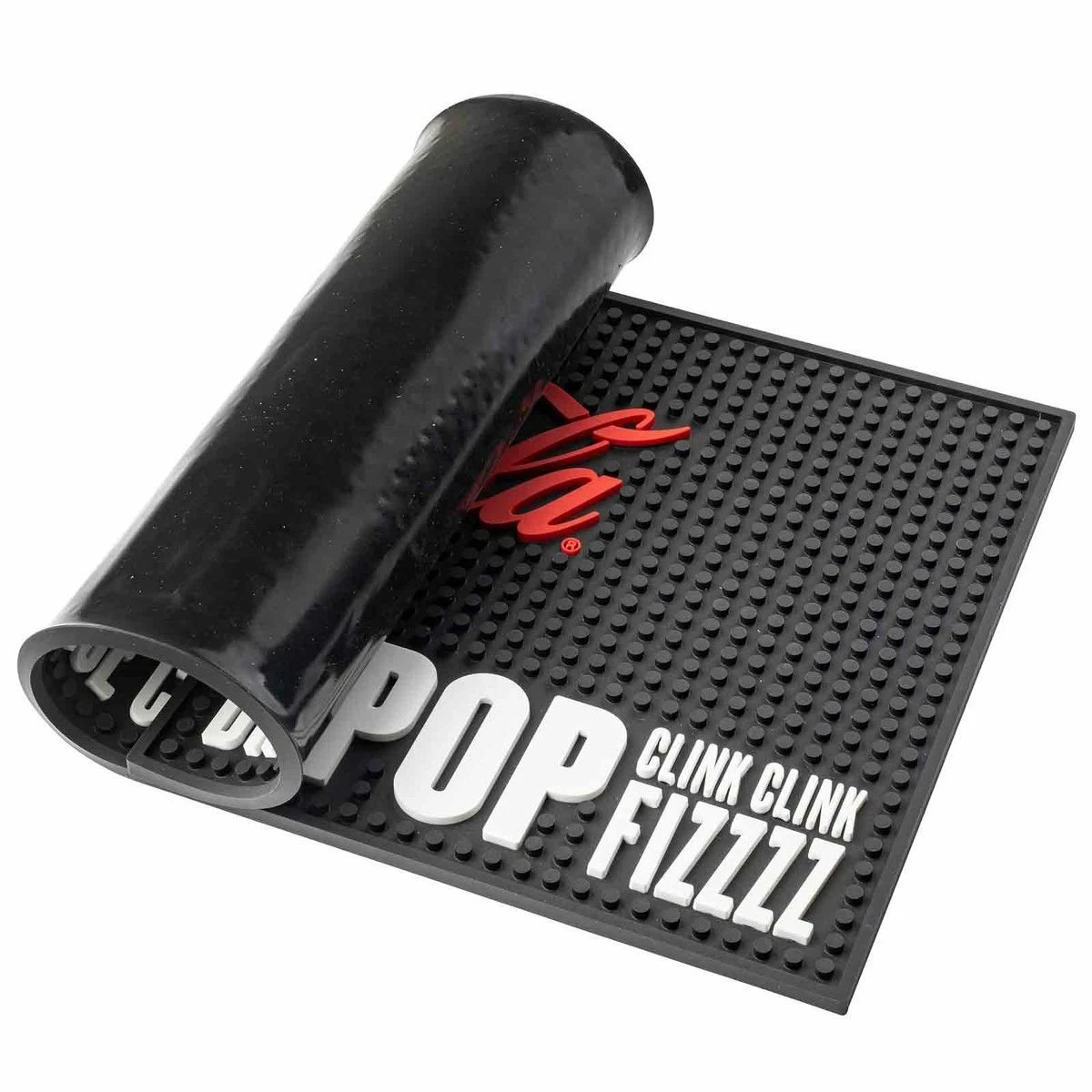 Give your home bar or drink station a touch of classic Americana and a protective surface with the 18″ x 10″ Coca-Cola Rectangular Bar Mat from TableCraft! The flexible PVC surface neatly collects condensation and spills and contains them on the mat, while the non-skid bottom keeps the mat from moving around in use. Easy to rinse off and roll up, the black mat is portable enough to take with you anytime you need to protect a surface from drips, drops, and splashes.
